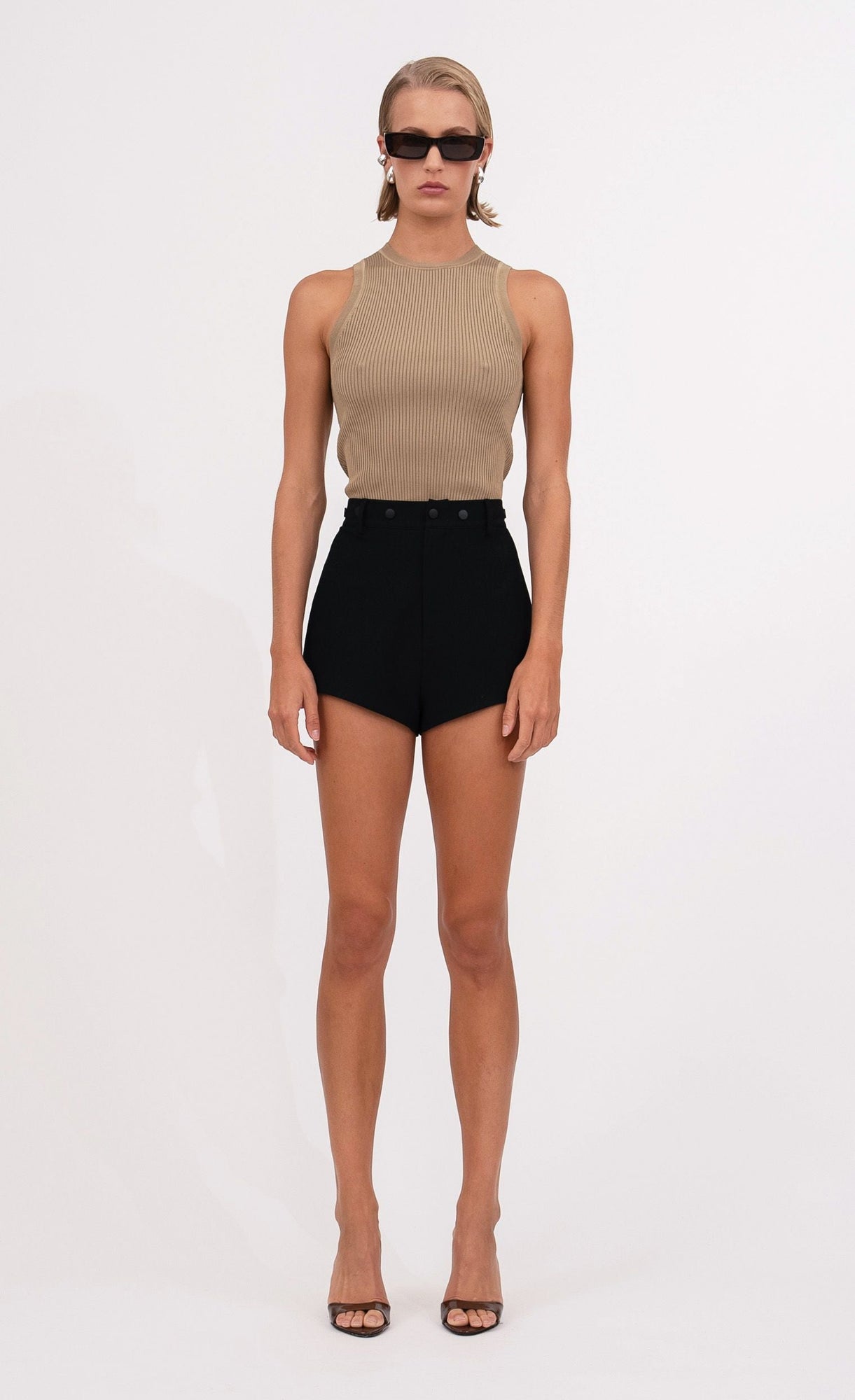 The Zehra Shorts are chic mini shorts featuring monochromatic black stud button details along the waistband. A modern twist on a timeless wardrobe staple, these shorts add a subtle yet stylish edge to any look. Perfect for effortless day-to-night styling.